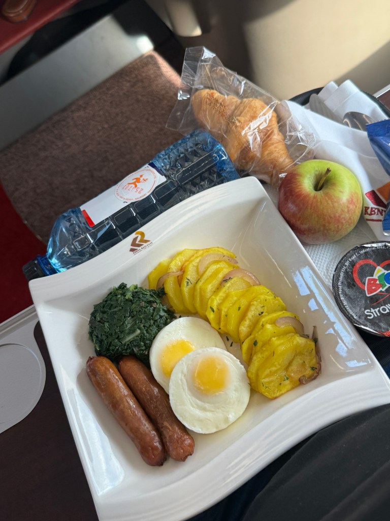 They served breakfast and I was actually impressed. Potatoes (seasoned, not plain), sautéed greens, two sausages, eggs, a croissant, an apple, strawberry yogurt and water (better than Ethiopia airline food) . I wasn’t starving, but the effort was giving luxury train picnic. A sweet touch.