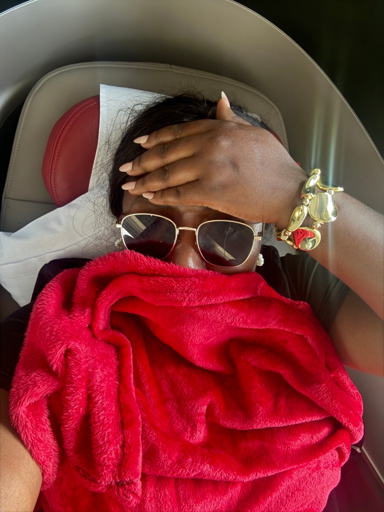 You already know I carried my plush red blanket and got cozy. I even took a little nap with my shades on like one celeb avoiding paparazzi 😂😂, Comfort? 10/10. Legroom? Plenty. Peace and quiet? Priceless.
